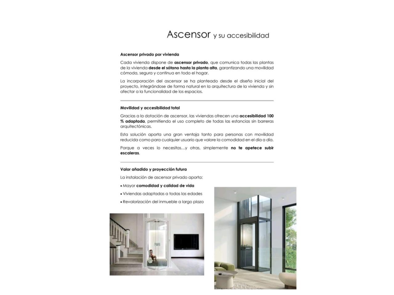 Todas contaran con ascensor privado desde la planta sótano hasta la planta alta y con sistema de individual de energía solar fotovoltaica (placas solares), de hasta 5,5KW.